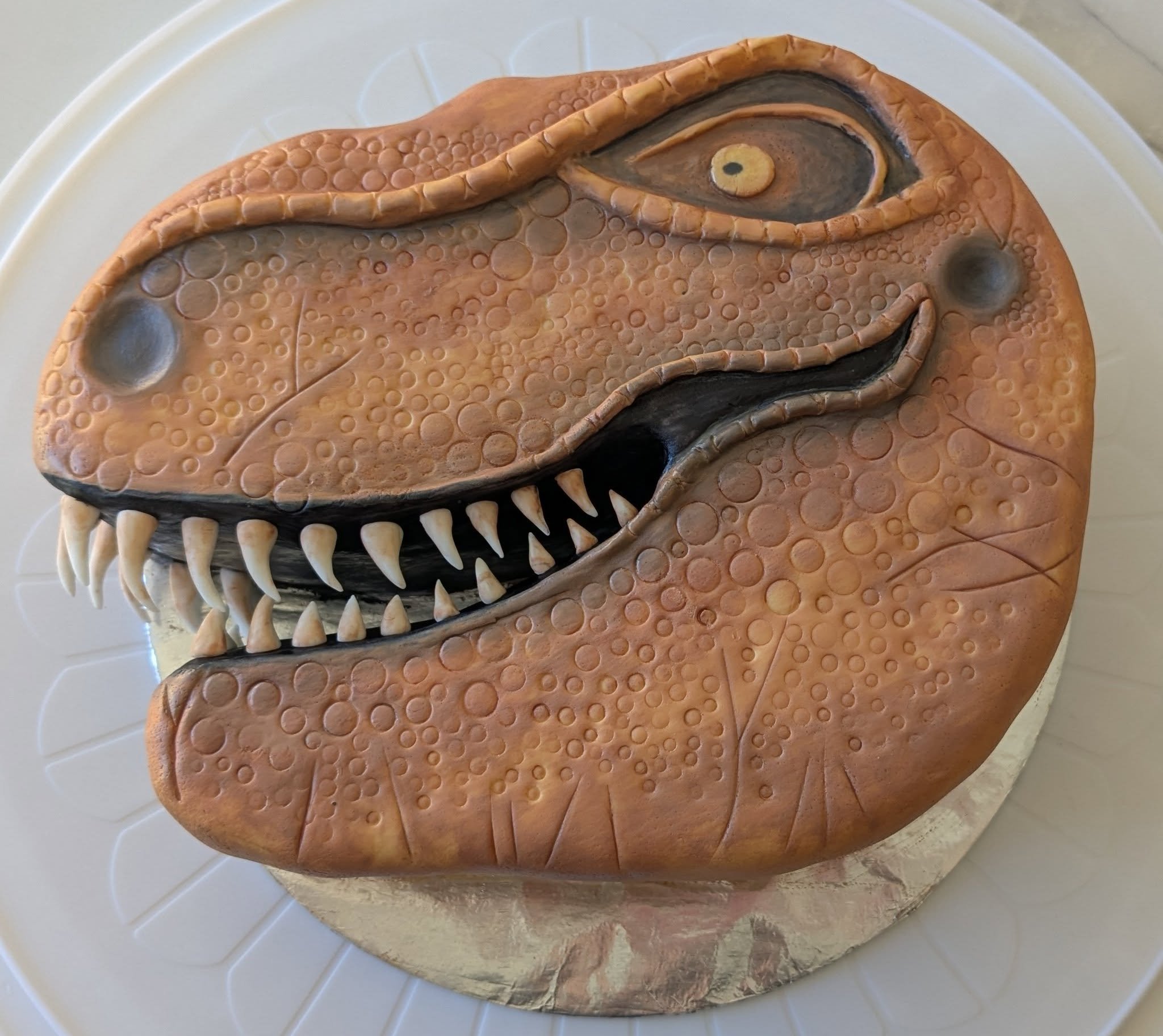 Made for a dinosaur fanatics 4th birthday, this T-Rex cake was made with a decadent chocolate Genoise Sponge, filled with a homemade dark Cherry Jam and Whipped double cream filling.